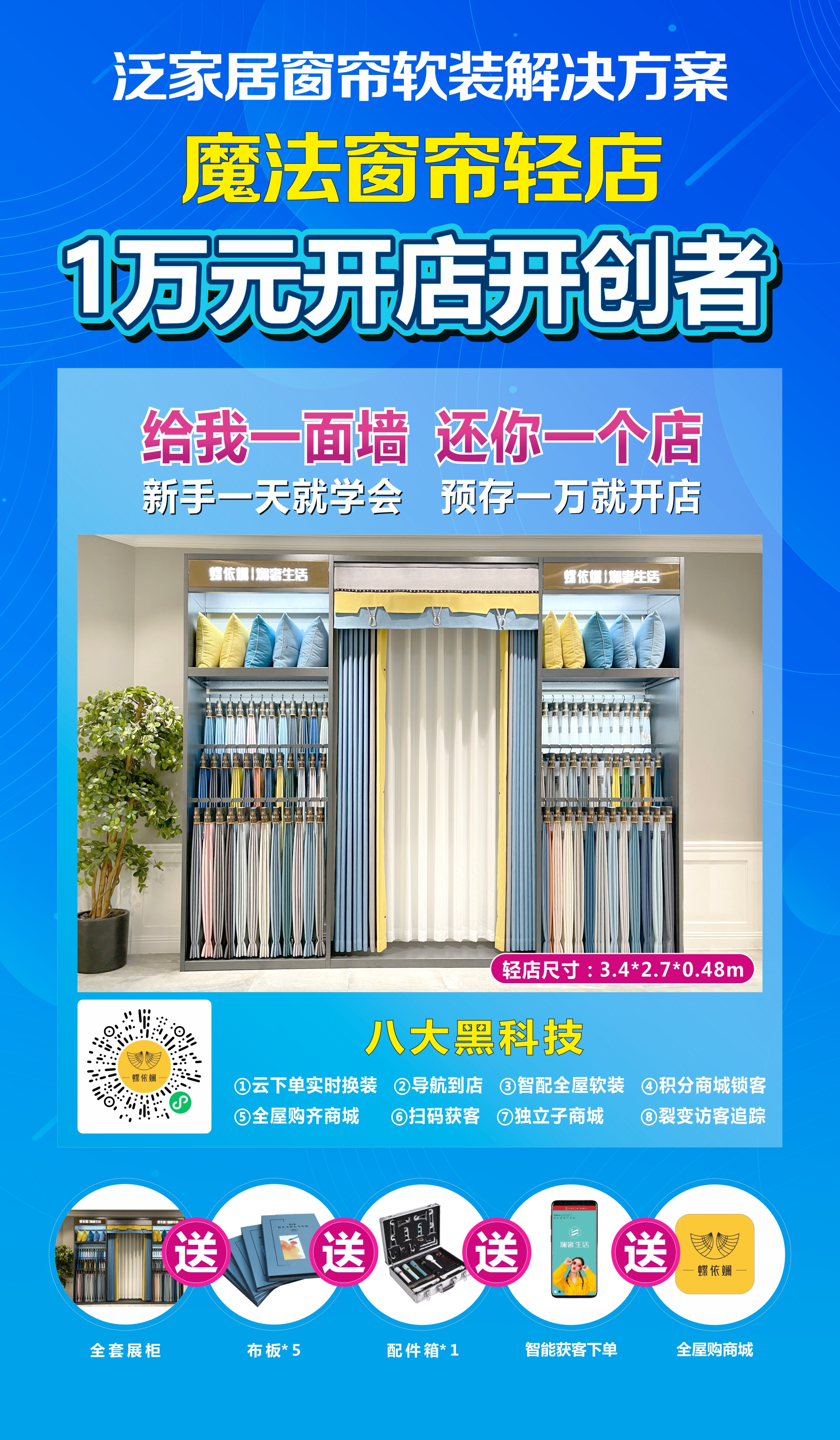 蝶依斕全屋購3.0版,以2022年發(fā)布的“魔法窗簾輕店”為入口,以全屋家居產(chǎn)品展示及搭配功能系統(tǒng),引導(dǎo)、培育經(jīng)銷商全案設(shè)計(jì)思維養(yǎng)成,實(shí)現(xiàn)單品類店向全案軟裝店轉(zhuǎn)型升級(jí),為傳統(tǒng)家居建材門店提供窗簾軟裝解決方案。獲客系統(tǒng)可將需求客戶線索推送到當(dāng)?shù)貙Yu店,向線下300多家專賣店、400多家魔法窗簾輕店精準(zhǔn)推流。