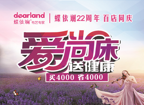 在蝶依斕22周年慶之際,煥新推出2016“愛(ài)尚床,送健康”——線(xiàn)上線(xiàn)下,百店同慶感恩活動(dòng),不要五毛錢(qián)的優(yōu)惠力度,唯有“買(mǎi)4000省4000”,才能不負(fù)蝶依斕22周年慶之名。僅需1888元,原售5888元的床和床墊CP帶回家,優(yōu)惠得不要不要的!