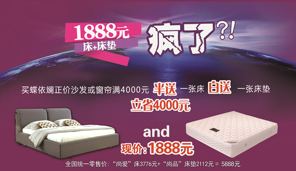 一是凡在蝶依斕全國(guó)各專(zhuān)賣(mài)店或天貓旗艦店、微店購(gòu)買(mǎi)蝶依斕正價(jià)沙發(fā)或窗簾滿(mǎn)4000元的客戶(hù),即可以1888元的價(jià)格,購(gòu)買(mǎi)專(zhuān)賣(mài)價(jià)5888元的“尚愛(ài)”軟床和“尚品”床墊一套,相當(dāng)于半送一張床、白送一張床墊!