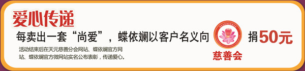 二是活動(dòng)期間每成功售出一套尚愛(ài)床和床墊,將由蝶依斕出資,以客戶(hù)的名義向慈善捐贈(zèng)50元。活動(dòng)結(jié)束后,將在慈善網(wǎng)站、蝶依斕官方網(wǎng)站、蝶依斕微網(wǎng)站實(shí)名公布表彰,傳遞愛(ài)心。