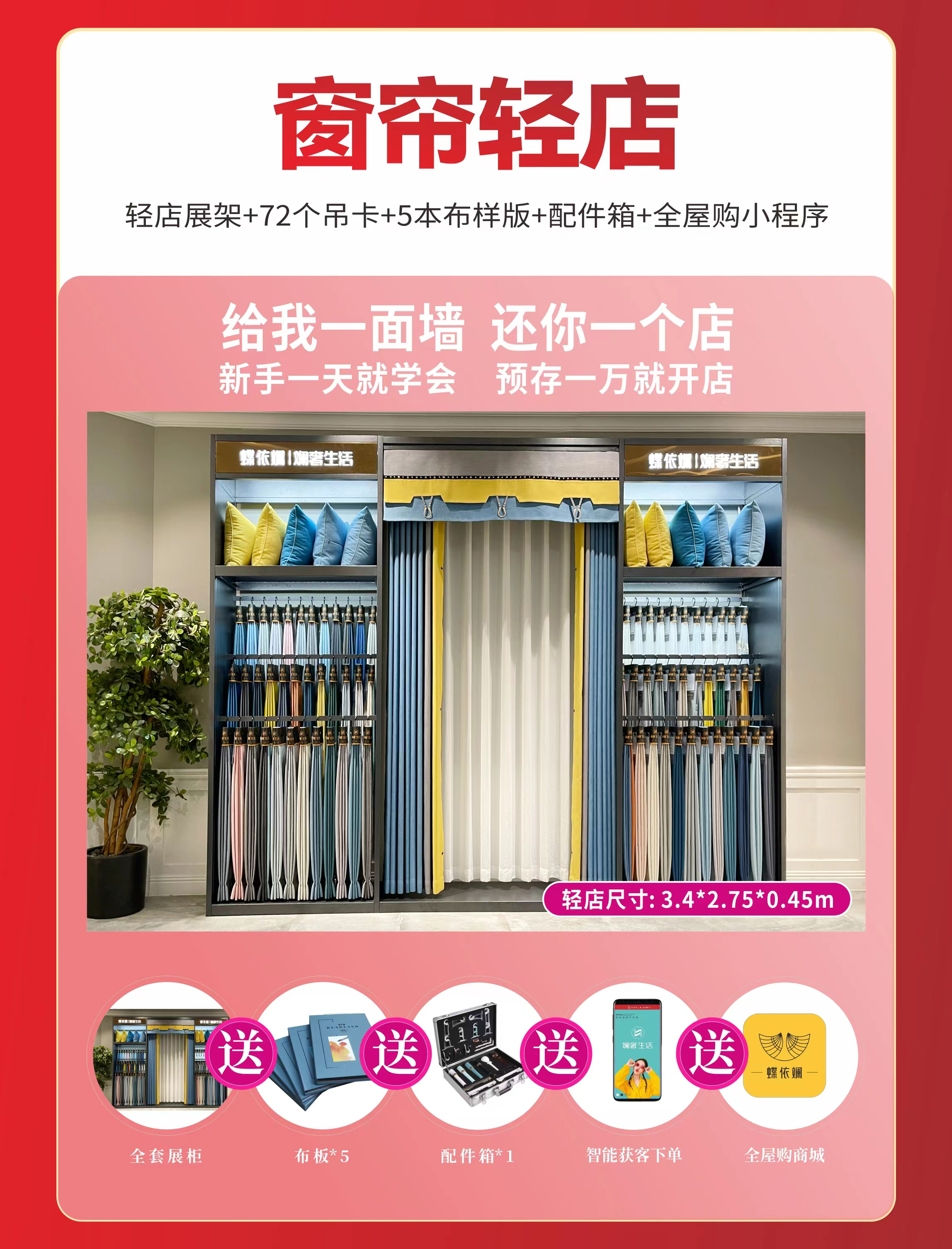 窗簾輕店定位是為家居門店提供窗簾軟裝解決方案,也成為了門店單品類競爭力不夠痛點(diǎn)的“解藥”。蝶依斕最近又相繼推出“窗簾網(wǎng)紅柜”、“窗簾微店”、“窗簾迷你店”、“窗簾卷王套餐”等新模式矩陣,為各類經(jīng)營者,提供了服務(wù)標(biāo)準(zhǔn)化、店態(tài)多樣化、產(chǎn)品個(gè)性化的窗簾方案,消費(fèi)者也能體驗(yàn)到設(shè)計(jì)更配套、性價(jià)比更高的產(chǎn)品。