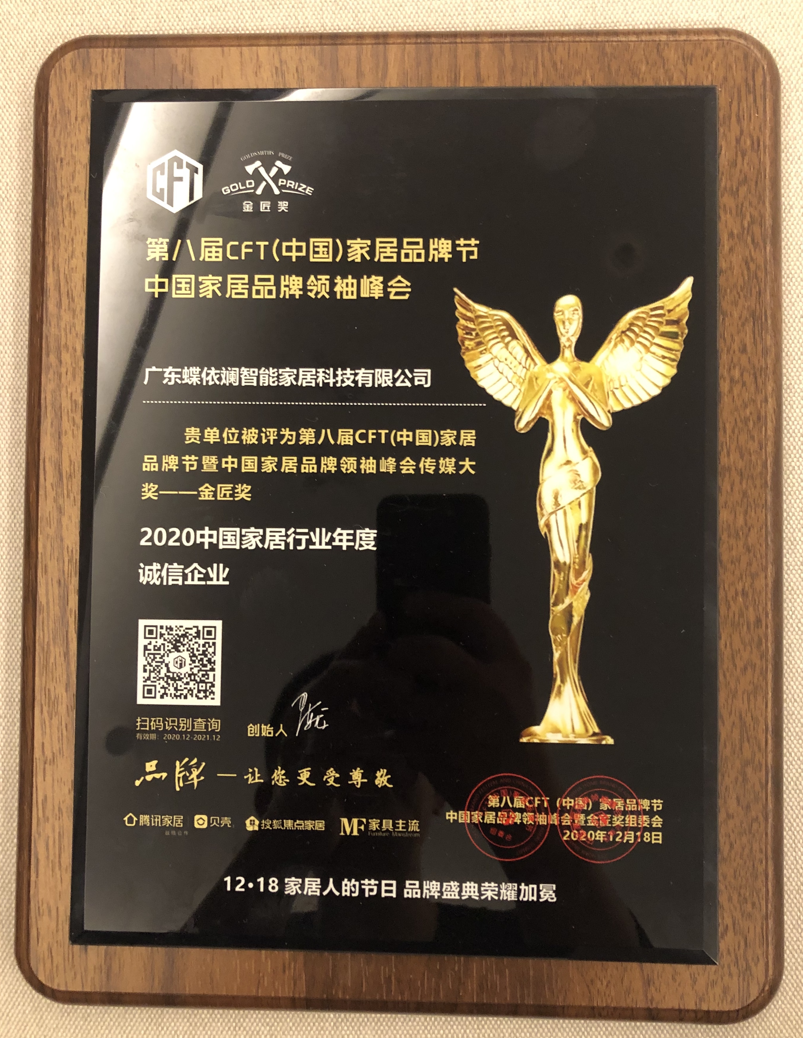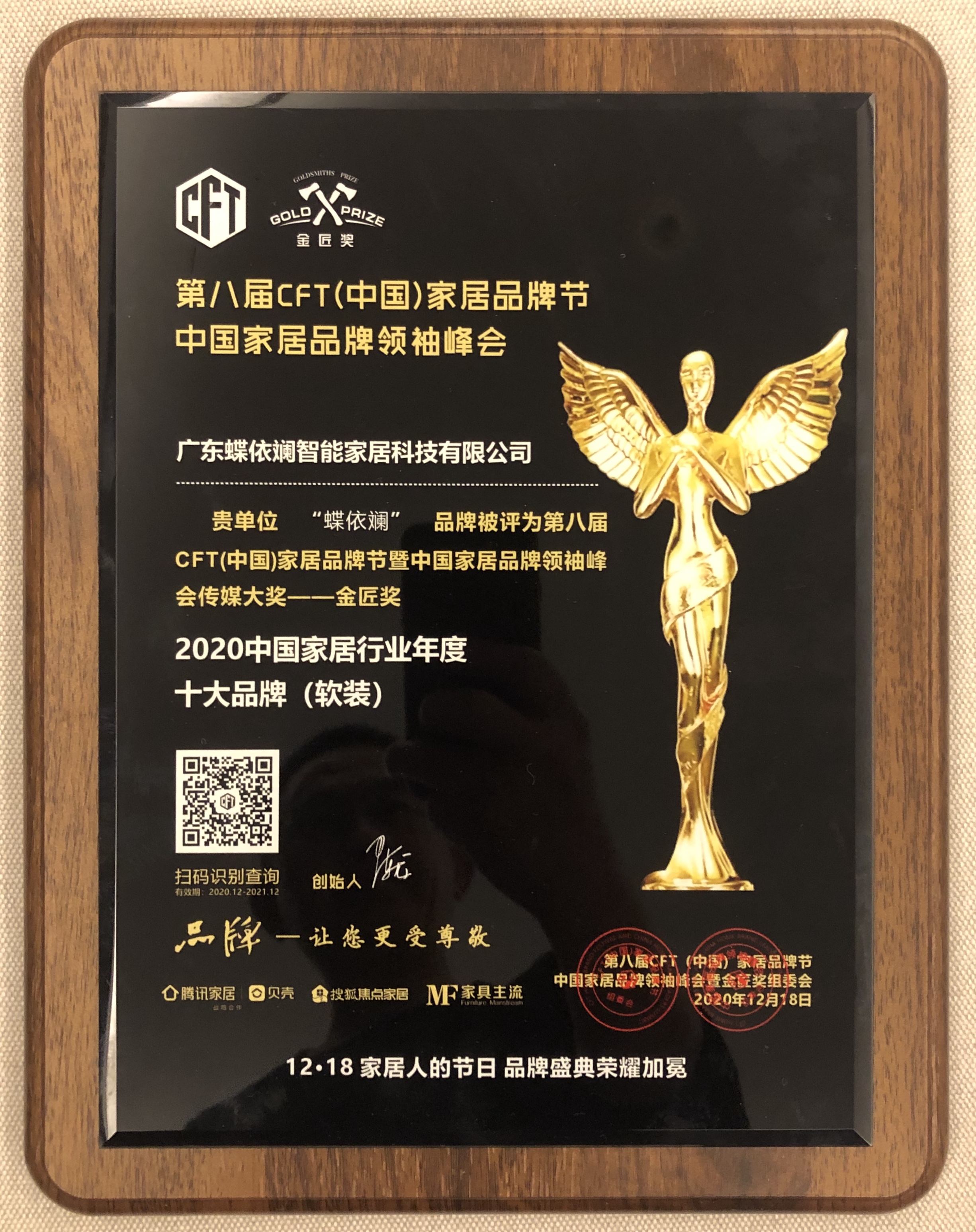蝶依斕在此次峰會(huì)上榮獲由中國(guó)家具品牌節(jié)組委會(huì)頒發(fā)兩項(xiàng)“金匠獎(jiǎng)”——2020中國(guó)家居行業(yè)年度十大品牌(軟裝)、2020中國(guó)家居行業(yè)年度誠(chéng)信企業(yè),蝶依斕董事長(zhǎng)周石旺先生代表公司受邀出席并領(lǐng)獎(jiǎng)。CFT 家居品牌節(jié)是家居行業(yè)規(guī)模大、規(guī)格高、影響深的行業(yè)盛典,此次能在國(guó)內(nèi)家具行業(yè)眾多一線品牌中脫穎而出獲此殊榮,是對(duì)蝶依斕在行業(yè)內(nèi)率先從窗簾、沙發(fā)、寢具產(chǎn)品生產(chǎn)轉(zhuǎn)化全屋配套大軟裝思路、歷年來(lái)堅(jiān)守產(chǎn)品品質(zhì)的極大肯定。經(jīng)過(guò)26年的發(fā)展,蝶依斕在業(yè)界的品牌影響力不斷增強(qiáng)。此次獲獎(jiǎng),既是實(shí)至名歸,也是極大的鞭策。
