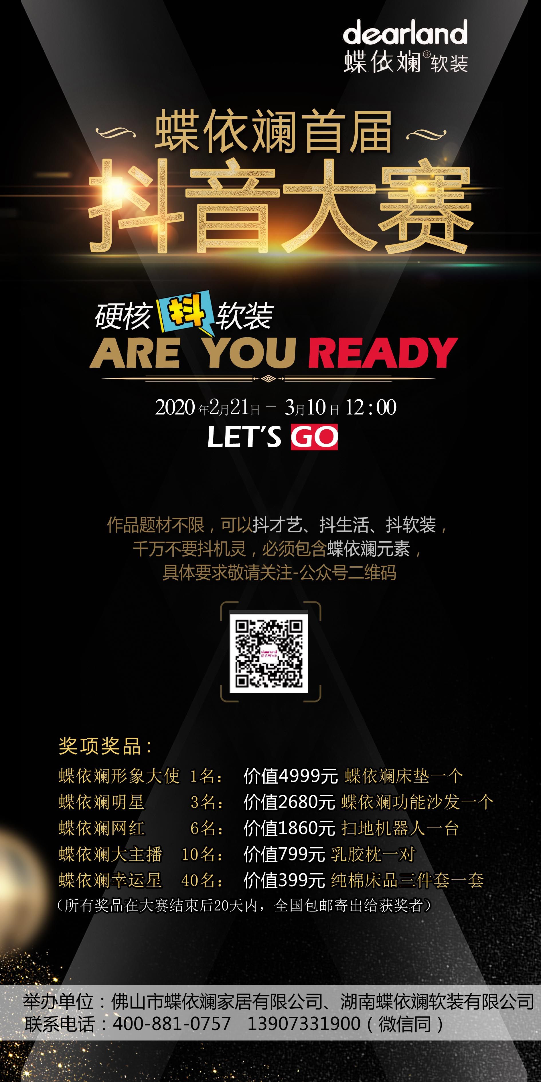 1、參賽時間內(nèi)在“抖音”發(fā)布包含蝶依斕元素(如有明顯的蝶依斕標示沙發(fā)or窗簾or床墊產(chǎn)品、蝶依斕LOGO、蝶依斕店面、蝶依斕宣傳廣告、“蝶依斕”字樣等)的實拍短視頻或圖文短視頻,標題#家居#軟裝#硬核抖軟裝。視頻不包含蝶依斕元素或標題未#家居#軟裝#硬核抖軟裝,視為未參賽。