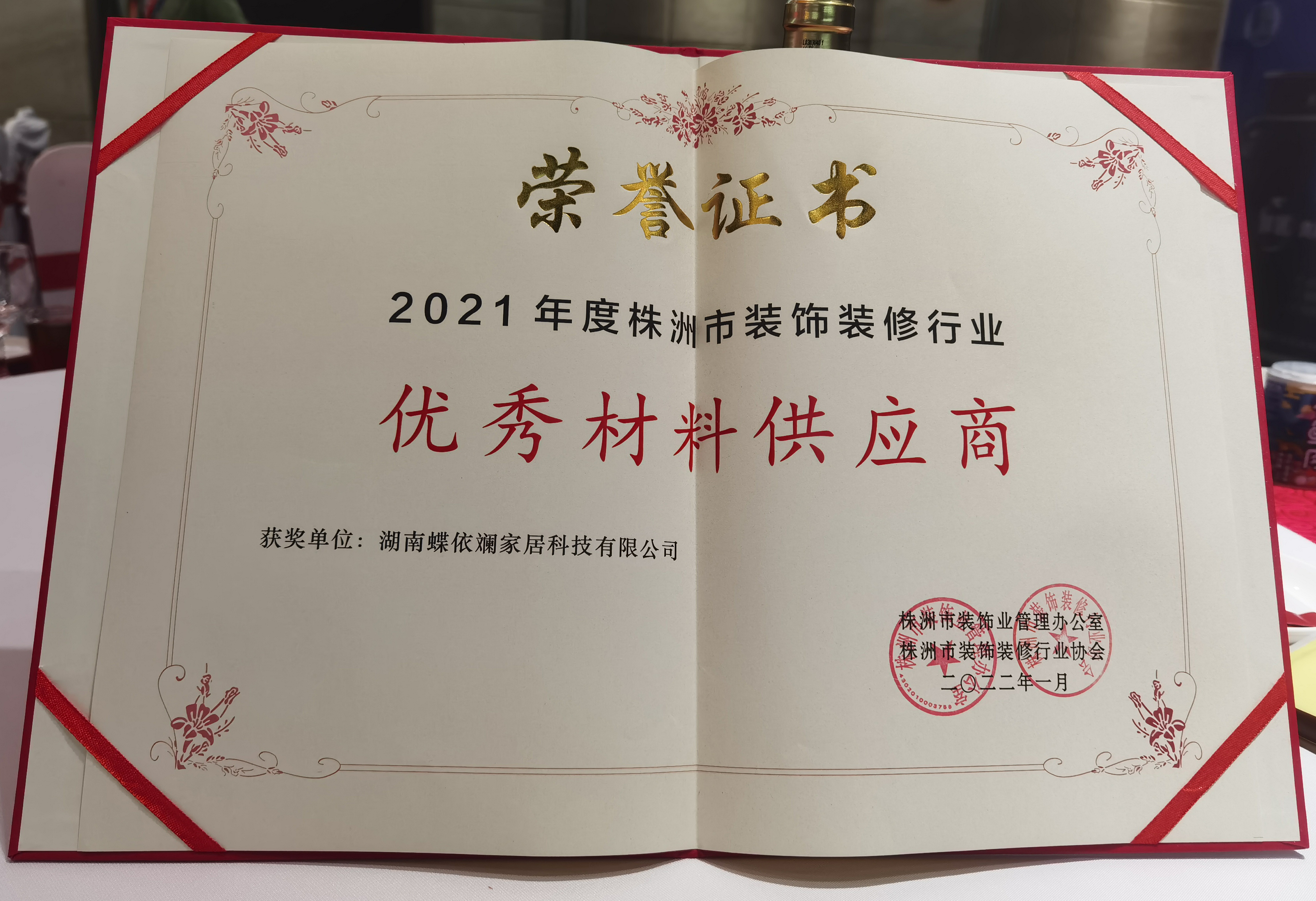 蝶依斕湖南公司連續(xù)多年蟬聯(lián)省、市裝飾裝修行業(yè)“優(yōu)秀材料供應(yīng)商”殊榮