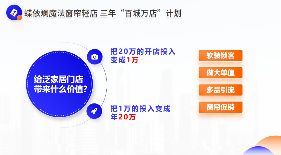 輕店作為行業(yè)首創(chuàng),市場需求大,深受泛家居門店經(jīng)銷商歡迎,門店業(yè)績提升效果顯著,目前,輕店年開店數(shù)量突破400多家,運營返單率達(dá)78%以上,蝶依斕(杭州)公司已啟動輕店“百城萬店”城市服務(wù)商計劃,計劃三年內(nèi),全面打通全國泛家居門店家居軟裝一站式服務(wù)城市站點。“魔法窗簾輕店”作為杠桿支點、將撬動泛家居門店提升業(yè)績、圈客創(chuàng)富的新藍(lán)海。