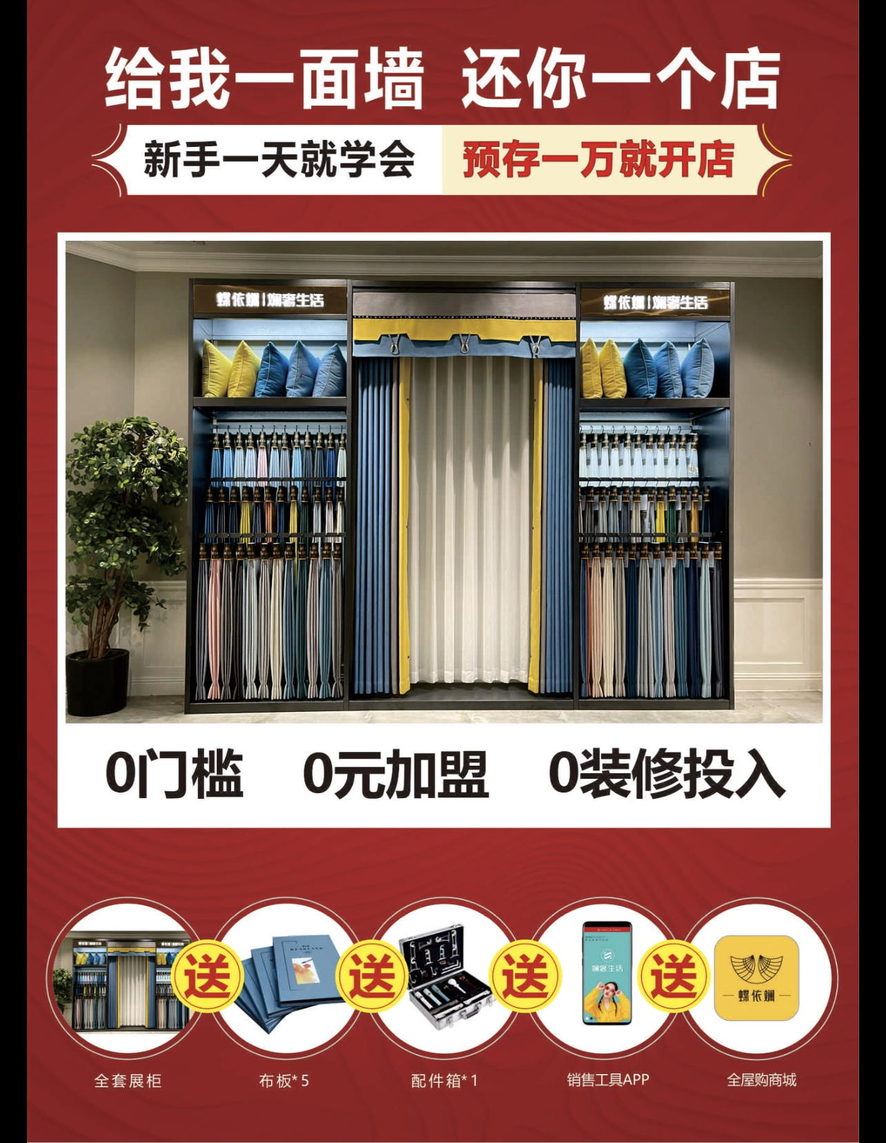 除了窗簾專賣店,蝶依斕與湖南工業(yè)大學(xué)產(chǎn)學(xué)研合作發(fā)布的“1111工程”-“魔法窗簾輕店",以“給我一面墻、還你一個(gè)店”、“新手一天就學(xué)會(huì),預(yù)存一萬就開店”、“0門檻、0元加盟、0裝修投入”等強(qiáng)力優(yōu)勢(shì),也在當(dāng)?shù)匾饛?qiáng)烈反響,并獲得市場(chǎng)份額。目前已吸引了超400家家居建材、墻布燈飾、家裝公司、室內(nèi)設(shè)計(jì)等經(jīng)營(yíng)業(yè)主加入。