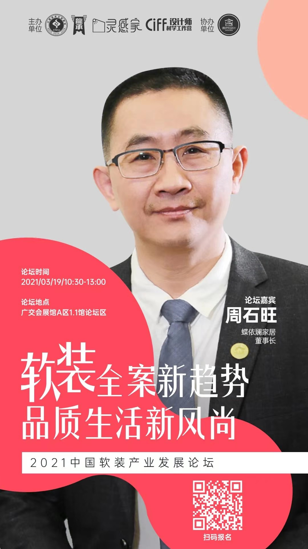 2021年3月19日,第47屆中國家博會(huì)(廣州)期間,由中國軟裝定制聯(lián)盟、【龍承獎(jiǎng)】組委會(huì)、靈感家、CIFF材學(xué)工作營主辦,舍然教育協(xié)辦的2021軟裝產(chǎn)業(yè)發(fā)展論壇在廣交會(huì)展館A區(qū)1.1館論壇區(qū)隆重開幕。蝶依斕魔法整家董事長周石旺作為特邀嘉賓參加了此次行業(yè)論壇。