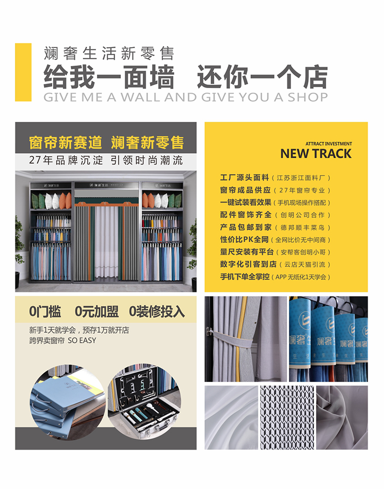 隨著“新零售”、“智能化”、“數(shù)字化”呼聲此起彼伏!斕奢生活“給我一面墻,還你一個店”窗簾輕店新模式,三月一經(jīng)推出即在行業(yè)引起廣泛關(guān)注和效仿。只需一面墻,就能做成一個集大樣展示、小樣擴(kuò)展、軌道配件、燈光照明、色彩搭配、工藝標(biāo)準(zhǔn)、產(chǎn)品圖冊等功能強(qiáng)大的“集成店”。總投資不超一萬元。從下單、窗簾效果預(yù)覽、傳送訂單到工廠等流程都在APP上用手機(jī)輕松搞定。全程帶你操作上手,教你運(yùn)營。“斕奢生活”一經(jīng)推出后熱度持續(xù)飆升,當(dāng)月簽店即超過100家。“給我一面墻,還你一個店” 迅速成為行業(yè)年度熱詞。