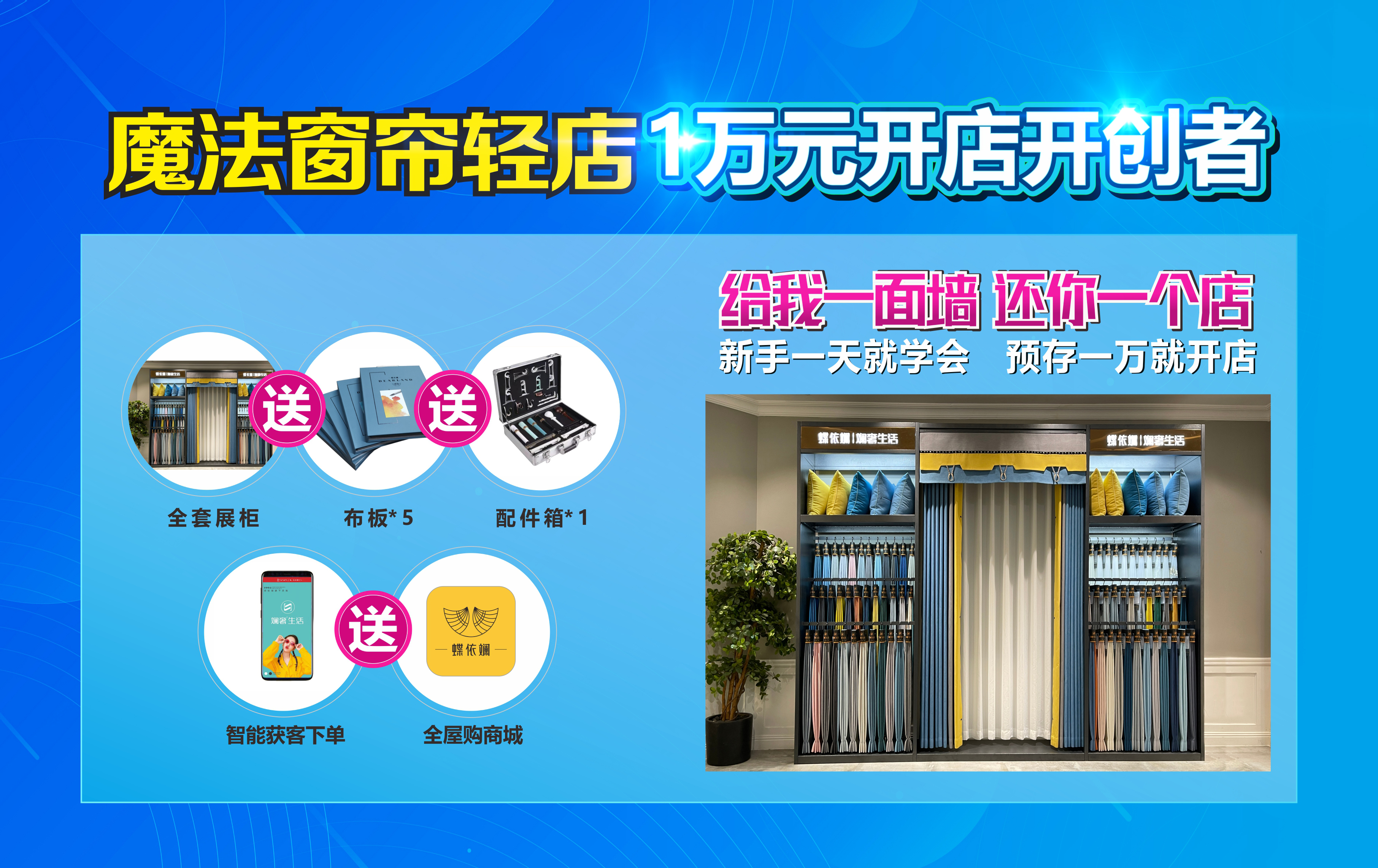 此次818超級云展泛家居招商盛宴,“魔法窗簾輕店”將以行業(yè)獨創(chuàng)、28年品牌能量亮相,“一面墻、一個展柜、預存一萬元貨款、一天學會接單運營”,“魔法窗簾輕店”現(xiàn)已在全國泛家居門店內開設400多家,相信通過此次818超級云展,借著居然之家深度賦能、泛家居招商俱樂部兵團集結、數(shù)字化招商等多方勢能聚集的東風,再次引爆全網(wǎng)!
