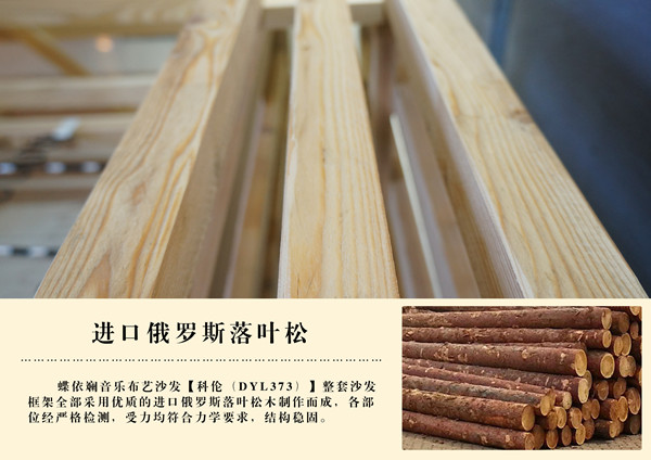 蝶依斕音樂布藝沙發(fā)科倫(DYL373)整套布藝沙發(fā)框架全部采用優(yōu)質(zhì)的進(jìn)口俄羅斯落葉松木制作而成,各部位經(jīng)嚴(yán)格檢測,受力均符合力學(xué)要求,結(jié)構(gòu)穩(wěn)固。底部木方采用凹槽工藝,行業(yè)首創(chuàng)。木架內(nèi)部印有“蝶依斕”LOGO防偽工藝。